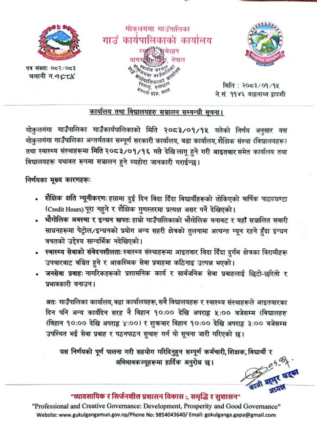 » कार्यालय र बिद्यालय संचालन हुने समय तालिका सम्बन्धी सूचना !