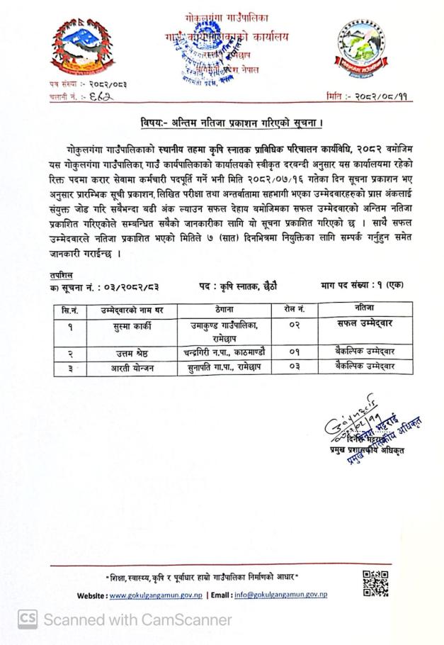 करार सेवाका विभिन्न पदहरुको अन्तिम नतिजा प्रकाशन गरिएको सूचना !