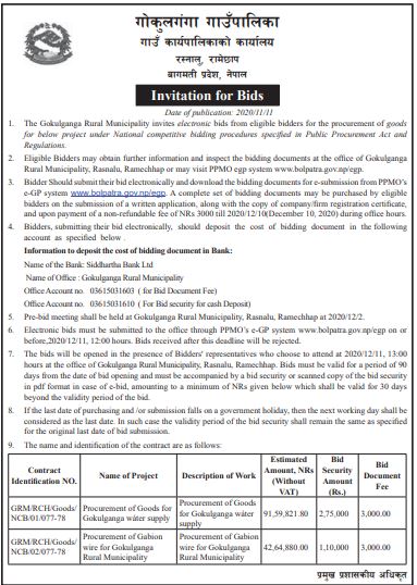 » खानेपानी र ग्याबिन जाली खरिद सम्बन्धि ठेक्काको बोलपत्र आहवन सम्बन्धि सूचना !