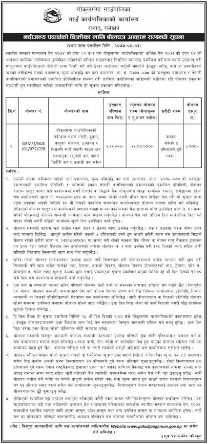 नदीजन्य पदार्थको बिक्रिका लागि बोलपत्र आवहान सम्बन्धि सूचना !