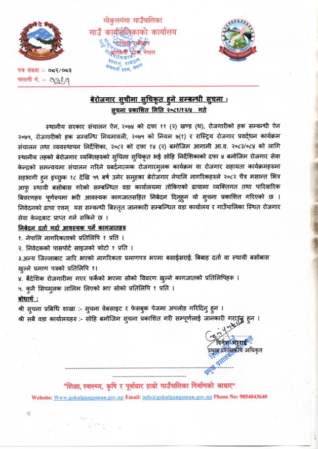 बेरोजगार सूचीमा सुचिकृत हुने सम्बन्धी सूचना !